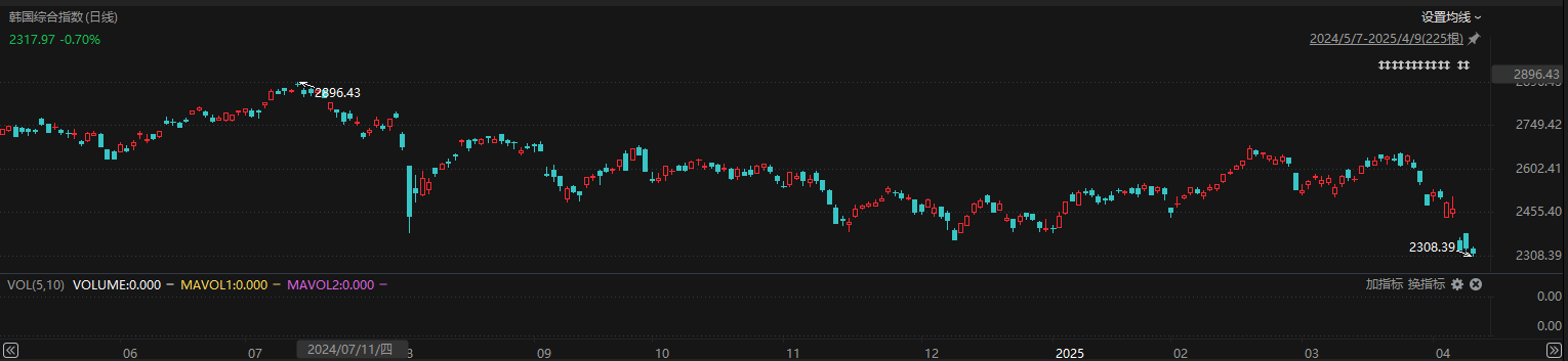 上证报中国证券网讯截至北京时间4月9日8时34分,韩国综合指数日内最低触及2308.39点,较2024年7月创下的阶段高位2896.43点下跌超过20%,一度跌进技术性熊市。